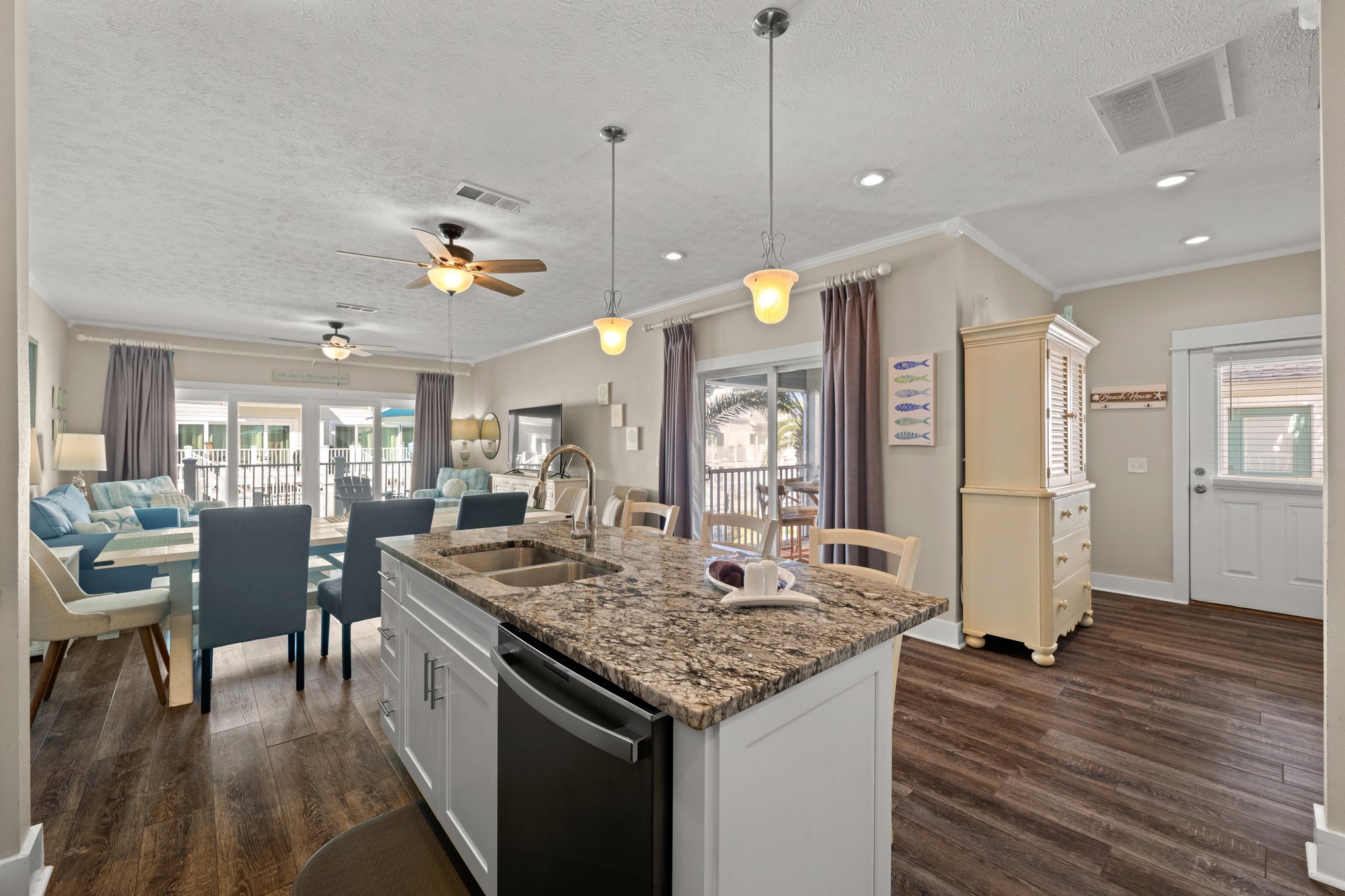 The townhome features two master suites, one on the main level with easy access and one on the top level with its own private screened porch with views of the ocean. In total, there are 5 porches including an open porch overlooking the pool area. The guest room is located on the second floor with balcony offering Gulf Views. There is also a Sleeping Loft with bunk beds for the kids! The Kitchen is fully equipped with everything to whip up the perfect meal with brand-new appliances & granite countertops. There is also a Keurig & Regular Coffee Pot! The living room opens onto a large open porch for sunning and also a screened porch that overlooks the pool, it is hidden behind beautiful palm trees for a little extra privacy. The Carport offers large storage for your beach toys.
